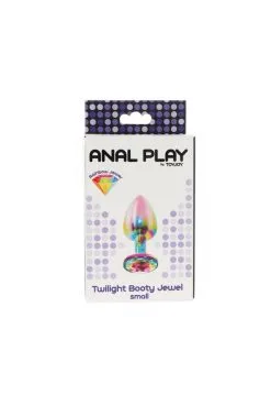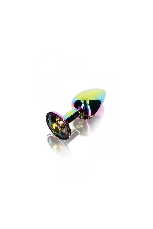 Petit plug anal en aluminium et verre acrylique, dimensions 7,2 x 2,7 cm, corps et bijou arc en ciel, by ToyJoy.