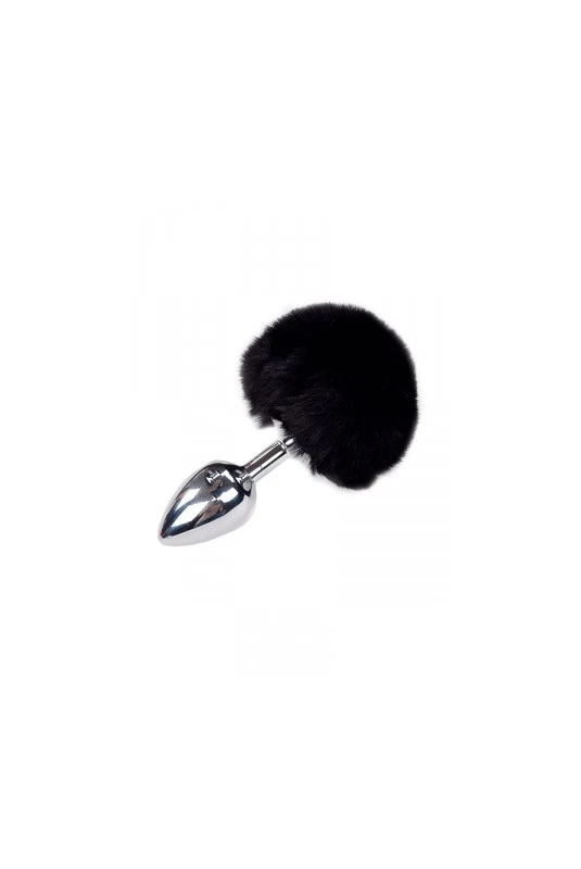 Plug anal en mĂ©tal, modèle Medium 8 x 3,5 cm, forme lisse, surmontĂ© d’un pompon noir en fourrure synthĂ©tique.