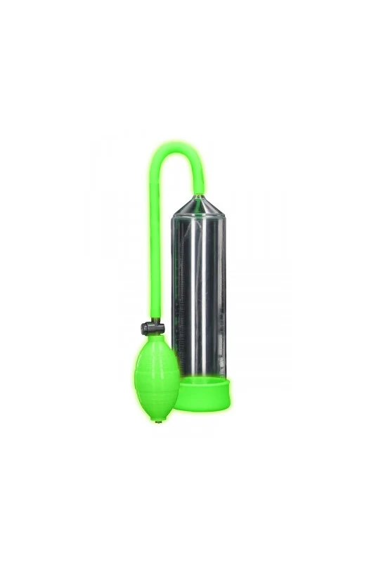 Pompe manuelle pour développer le pénis, avec cylindre transparent et pièces en silicone vert fluo, pour briller dans le noir.