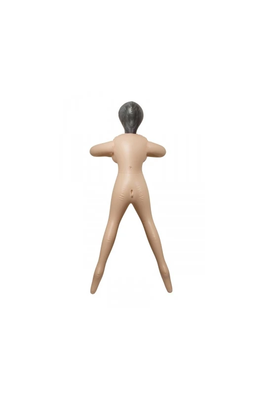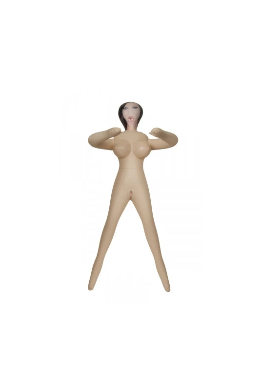 Poupée gonflable 3 orifices, en position debout pour vous permettre de la pénétrer de multiples manières.