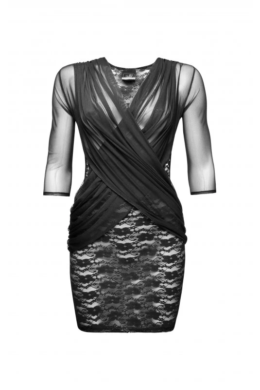 Robe moulante sexy en dentelle noire drapée de tulle croisé sur le devant.