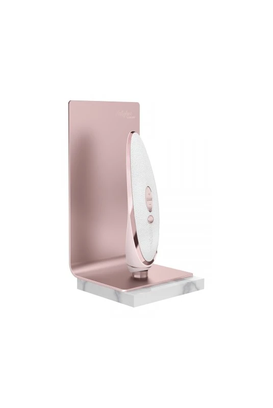 Luxueux stimulateur clitoridien sans contact en cuir blanc et métal rose gold offrant des orgasmes rapides, intenses et multiples.