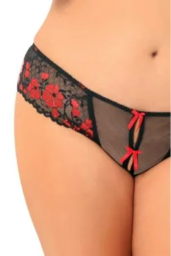 String Ouvert Grande Taille Noir Fleurs Rouges